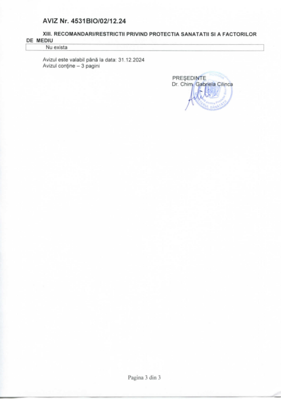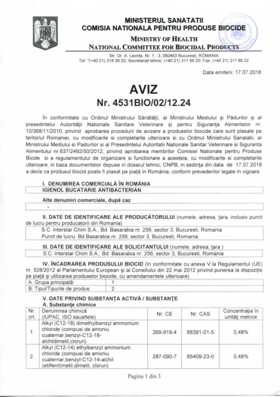Produsul este testat de Institutul National de Cercetare- Dezvoltare pentru Microbiologie-Imunologie „Cantacuzino”. Igienol este avizat de Ministerul Sanatatii.