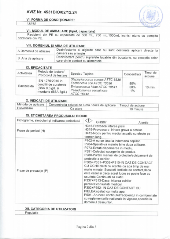 Nu folositi produsul pe ferestre, oglinzi, tesaturi si suprafete vopsite sau lacuite. A nu se folosi impreuna cu alti detergenti sau dezinfectanti. Produs avizat de CNPB.