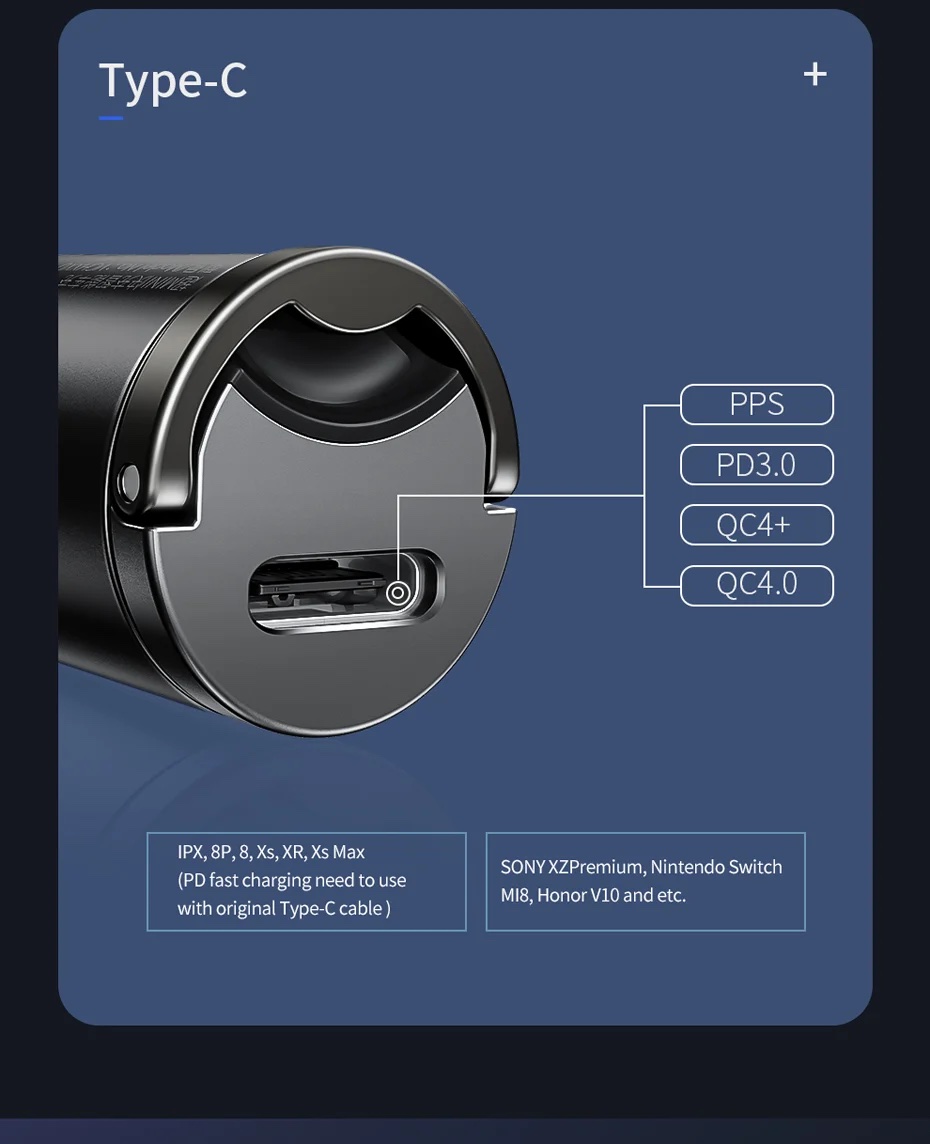 Incarcator autooriginal Baseus pentru telefoane si tablete cu functie de incarcare rapida PD Quick Charge / Fast Charge.