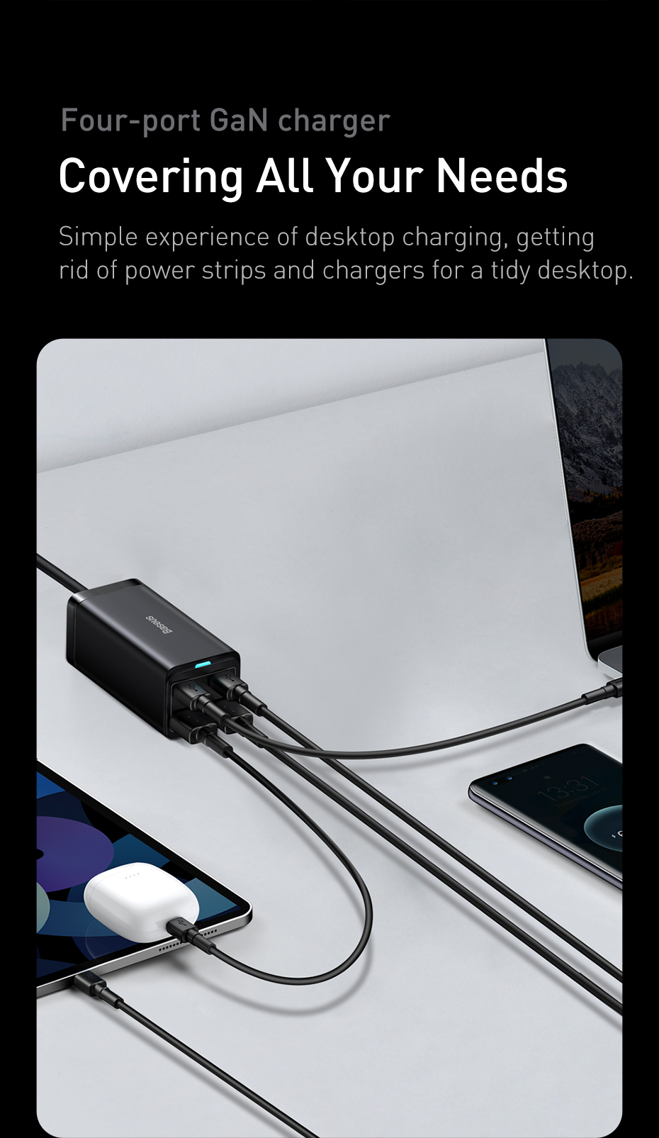 Datorita tehnologiei de alocare inteligenta Baseus BPS, acest incarcator GaN3 poate alimenta Airpod-urile, iPad-ul, iPhone-ul si Samsung galaxy S20 impreuna. (PS: Cand au fost conectate mai multe dispozitive, incarcatorul trebuie sa aleaga protocolul de incarcare rapida potrivit si sa imparta puterea fiecarui dispozitiv, ceea ce va cauza deconectarea de 2-3 ori inainte de a intra in incarcare rapida, este o masura de siguranta.)