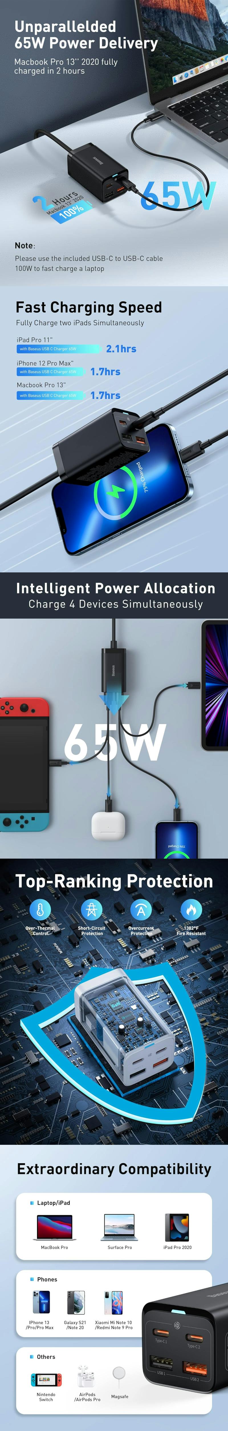 Viteza de incarcare USB-C de pana la 65W pentru a va incarca Macook pro 13" in mai putin de 2 ore. De asemenea, compatibil cu incarcare rapida Apple 20W PD si Samsung AFC 45W, incarcand iPhone 13 pana la 50% in jumatate de jumatate ora, de trei ori mai rapid decat incarcatorul original de 5 W.