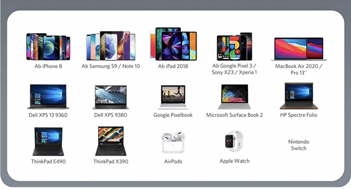 - iPhone 13 / 13 Mini / 13 Pro / 13 Pro / 13 Pro Max / iPhone 12 / Pro / mini / Pro Max / SE 2020 / 11 / 11 Pro / 11 Pro Max / XS / XS Max / XR / X; iPad 10,2''/ iPad mini 8,3''/ iPad mini 5 / 4, iPad Pro.Galaxy S22 / S22+ / S22 Ultra / Galaxy S10 / S10+ / S10e / S9 / S9+ / S8 / S8+, Note10 / 9 / 8, Pixel 3a / 3XL / 3 / 3 / 2 XL / 2, si multe altele.Google Pixel 3 si versiunile ulterioare, Sony XZ3, Sony Xperia 1, Nintendo Switch, Apple Watch, Apple Watch, AirPods si incarcatorul wireless magnetic Anker cu cablu USB-C.