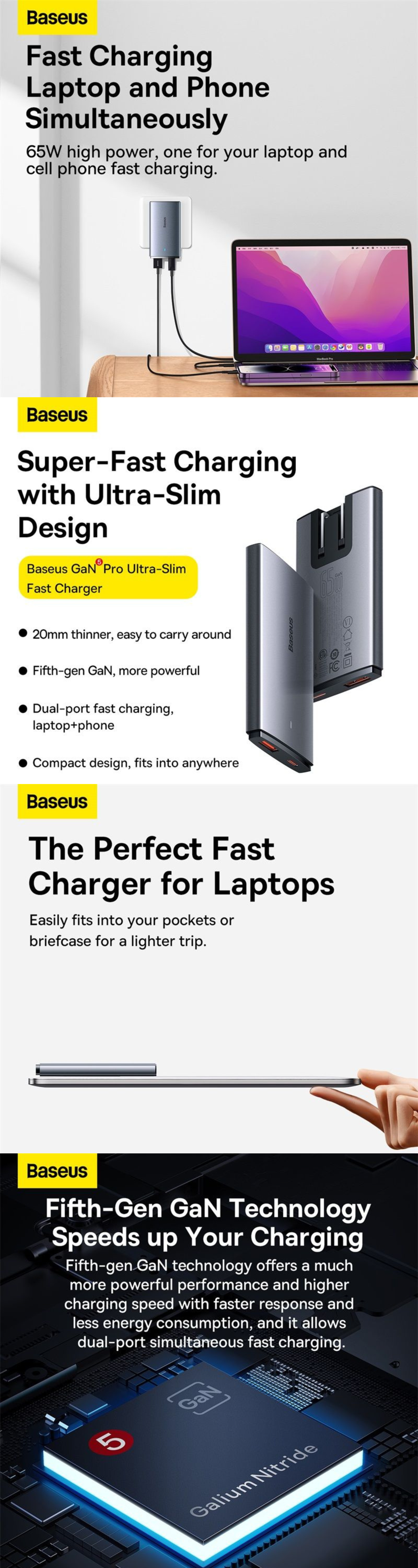 Incarcator retea Baseus GaN5 Pro Ultra Slim, 65W, USB, USB-C, Cablu inclus