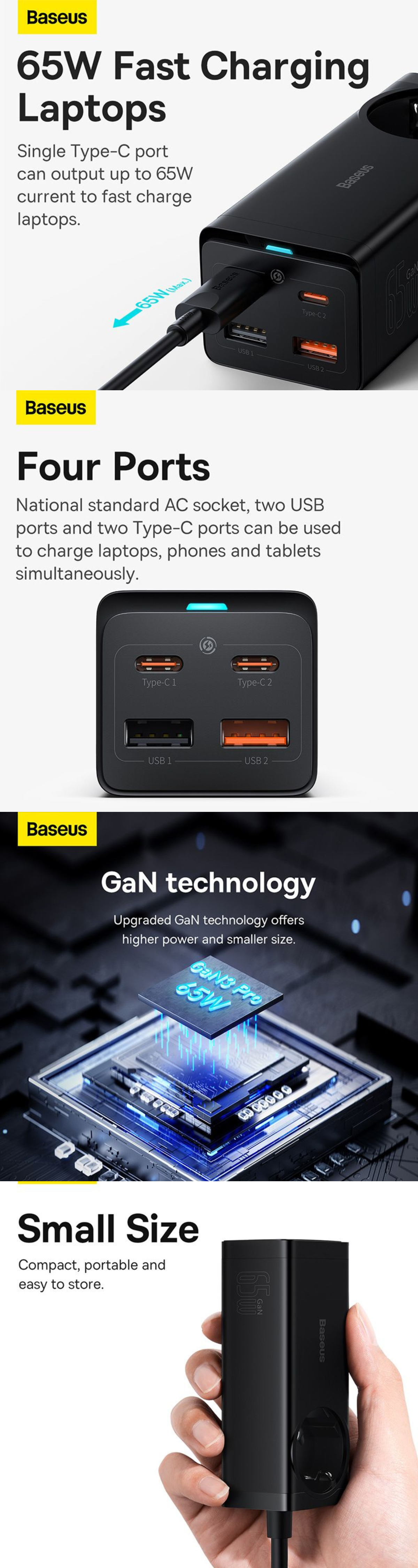 Incarcator retea Baseus PowerCombo Digital PowerStrip, 2 prize AC, 1x USB-C, 1x USB-A, cablu retractabil USB-C, 65W, lungime cablu 1.5m, Negru
