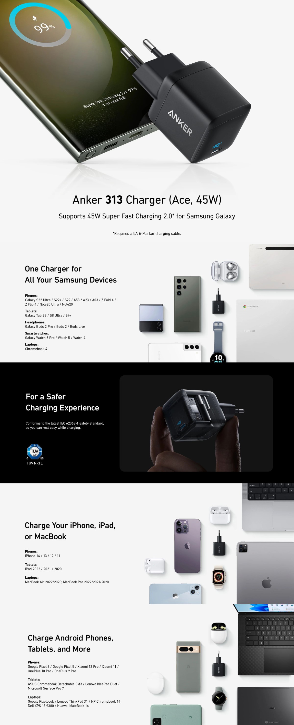 Ce primiti:Incarcator Anker 313 (Ace, 45W), ghid de bun venit, garantie (cablul nu este inclus).