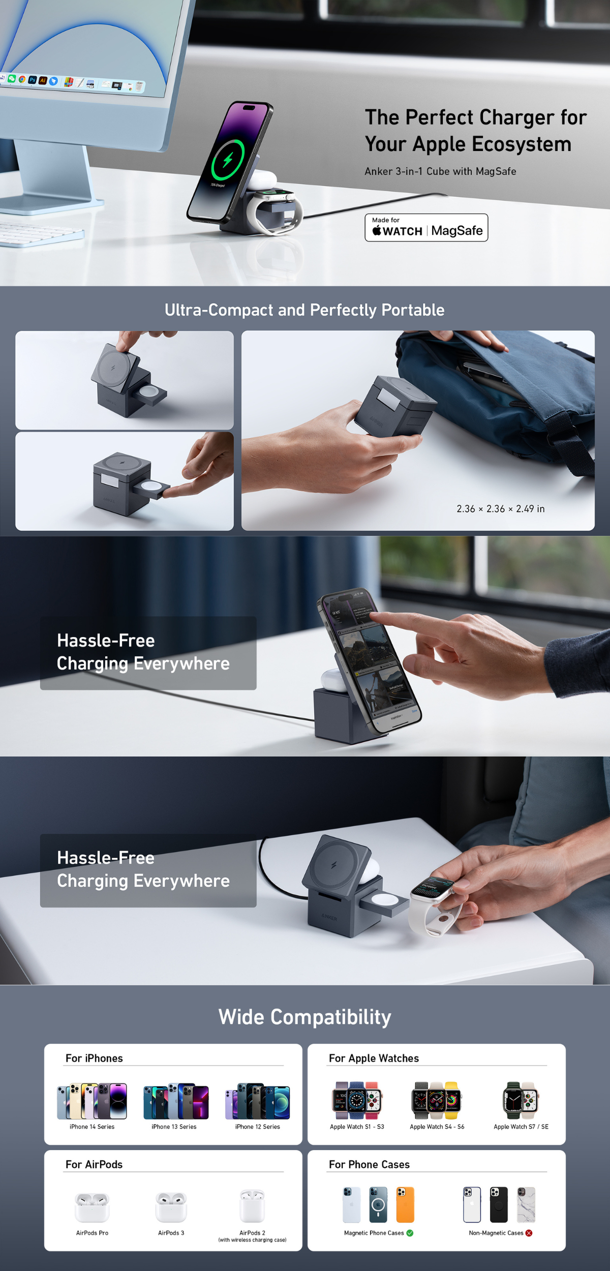 Incarcator wireless magnetic Anker 3-in-1 Cube MagSafe, 15W, Fast Charging, Pliabil, Negru
