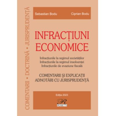 Infractiuni economice. Editia 2023 reprezinta o noutate in materie nu prin temele abordate ci prin faptul ca reprezinta produsul muncii unui comercialist si a unui penalist. In conditiile in care dispozitia normei penale face trimitere explicit sau implicit la notiuni de drept economic societar falimentar sau fiscal apreciem ca este datoria comercialistului sa participe la descifrarea sensului ipotezei pentru ca o aplicare a viziunii pur penale intr-un domeniu prin excelenta al dreptului privat poate duce la concluzii eronate cu consecinte grave asupra subiectilor infractiunilor in speta. Pentru a acoperi intreaga suprafata interpretativa aspectele de drept public trebuie desigur tratate cu aceeasi grija astfel incat cititorul sa isi faca o idee corecta si completa despre un domeniu pe care putini s-au incumetat sa il exploreze intr-un mod interdisciplinar. In editia de fata a lucrarii Infractiuni economice. Editia 2023 a patra comentariile infractiunilor analizate au avut in vedere modificarile aduse prin O. U. G. nr. 130 2021 pentru infractiunile cuprinse in Legea nr. 241 2005 si Legea nr. 265 2022 pentru infractiunea prevazuta de art. 2703 din Legea nr. 31 1990 iar jurisprudenta a fost completata cu extrase din spete pronuntate in perioada 2021-2022 inclusiv cu jurisprudenta obligatorie.Specificatii