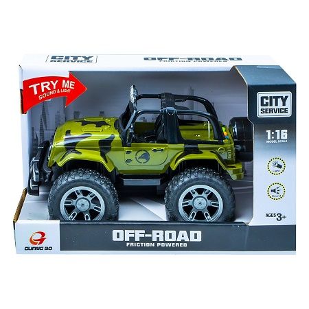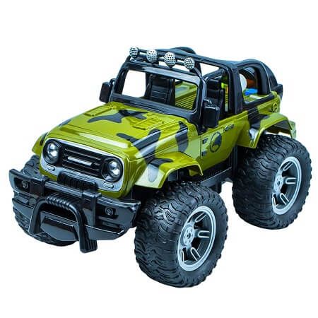 Copiii care sunt atrasi de masinile de teren isi vor dori cu siguranta acest jeep armata de jucarie. Caracteristici - Jucaria imita foarte bine realitatea si este foarte atractiva datorita design-ului modern. - Vehiculul are roti mari cu striatii pentru o deplasare usoara. Acest jeep are frictiune pe rotile din spate. - Masina are 3 butoane care declanseaza lumini si sunete specifice de pornire motor claxon alarma de parcare. Pentru aceasta are nevoie de 3 baterii AG13 incluse . Bateriile se introduc in spatiul destinat in pozitia corecta respectandu-se polaritatea. Compartimentul bateriilor trebuie sa fie curat. Bateriile epuizate se schimba si se recicleaza conform normelor in vigoare. In cazul neutilizarii jucariei pentru mai mult timp se scot bateriile pana in momentul refolosirii. - Designul masinii este foarte atractiv avand garda la sol inalta si bara de protectie in fata. In spatele jeep-ului este roata de rezerva. - Scara la care este realizat jeep-ul este de 1 16. - Jucaria este realizata din plastic de calitate non-toxic. - Masina dezvolta abilitatile motrice dexteritatea inteligenta si imaginatia si ii ajuta pe copii sa invete notiuni despre transport. - Jucaria este ambalata in cutie din carton decupata. Dimensiune jeep 20. 5x13x12 cm Avertizare Produsul este nou si comercializat in ambalajul original al producatorului. Imaginile de pe acest site au caracter informativ. Nuanta tonul si intensitatea culorii pot varia in functie de monitor. Ambalajul trebuie indepartat recuperat si aruncat de catre un adult inainte de a se da spre utilizare copilului. Nu lasati ambalajele produselor la indemana copiilor. Se recomanda utilizarea produsului sub supravegherea unui adult. Produsul poate contine piese mici care se pot inghiti sau inhala de cei mici existand pericolul de sufocare sau nu este potrivita copiilor mai mici de 3 ani. Pastrati instructiunile si etichetele pentru referinte viitoare. Pastrati produsul departe de foc si nu il lasati in preajma temperaturilor ridicate si a umiditatii. Datorita masurarii manuale a produsului poate exista o diferenta minora fata de dimensiunea reala a produsului.Specificatii