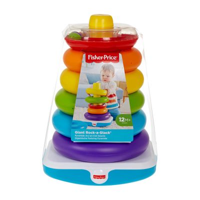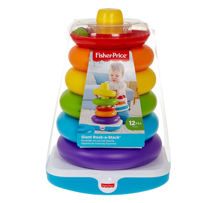 Cu o inaltime de peste 35 centimetri, Fisher-Price Giant Rock-a-Stack, aduce jocul clasic de stivuire la o noua inaltime. Bebelusul tau poate apuca si scutura cele sase inele colorate, de dimensiuni mari, apoi sa le ridice in sus si sa le potriveasca in baza. Cel mai mic inel are o suprafata stralucitoare, reflectorizanta, pentru ca bebelusul sa poata descoperi in interior margele colorate, involburate, care fac sa rasune zgomote distractive! Stand in picioare pentru a arunca inelele pe baza ajuta la intarirea echilibrului si abilitatilor de coordonare ale bebelusului. Strangerea si stivuirea inelelor ajuta la intarirea dexteritatii si a coordonarii mana-ochi. Sa-ti dai seama cum sa sortezi si sa stivuiesti inelele de la cel mai mare la cel mai mic contribuie la promovarea gandirii orientata spre rezolvarea problemelor!