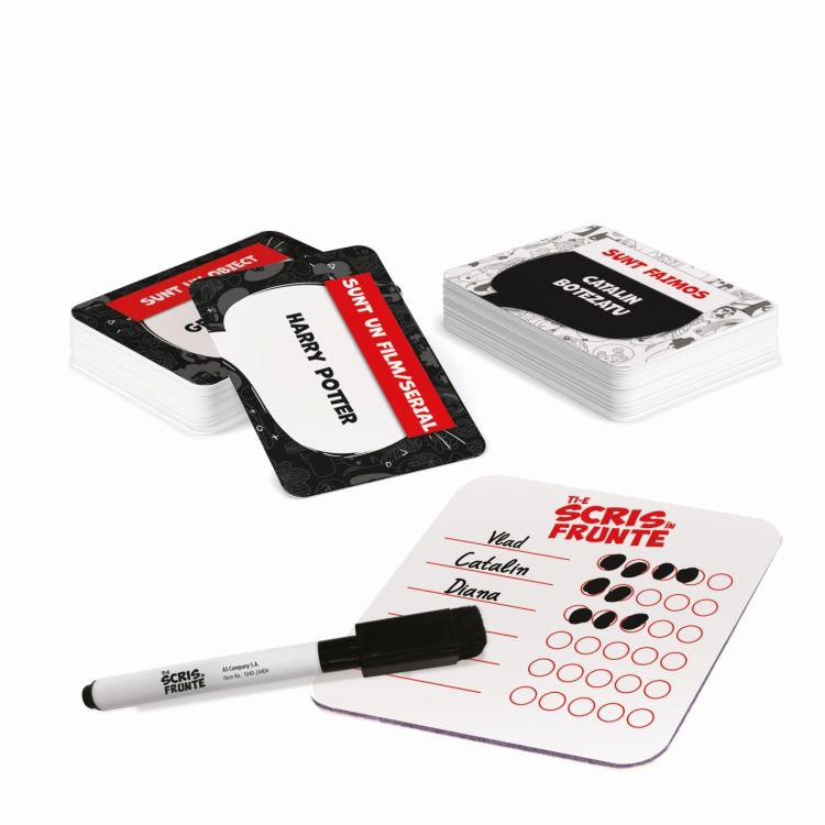 Jocul include 60 de carti cu 120 de teme 1 carte de punctaj refolosita 1 marker cu guma de sters o brosura de instructiuni.Specificatii