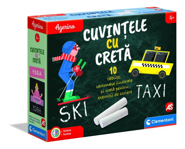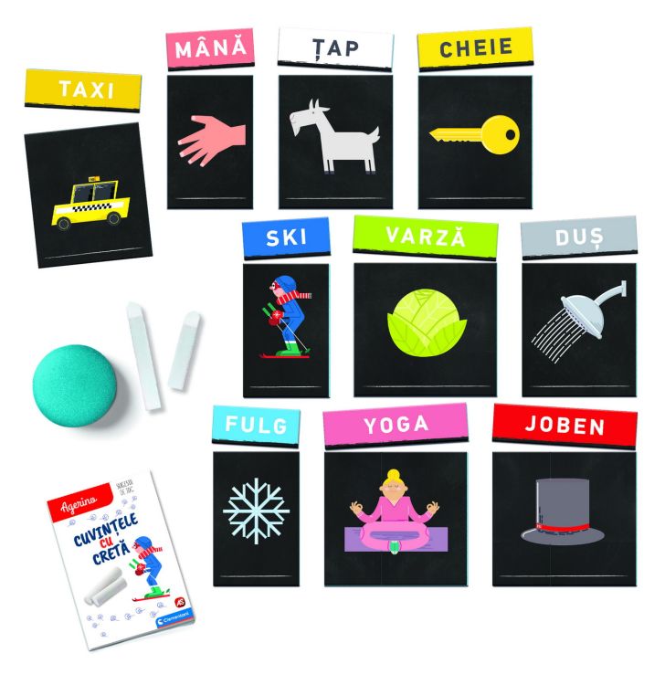 "Cuvintele cu creta" este un joc din seria "Invatarea prin emotie" care are drept scop dezvoltarea inteligentei emotionale la copii. Prin joc, copilul poate executa pasii fundamentali utilizati in procesul de scriere, prin antrenarea miscarilor fine ale mainii si practicarea tinerii instrumentului de scris. Utilizarea cretei ofera posibilitatea de a scrie si sterge de nenumarate ori! Copiii vor observa atent imaginile de pe 10 tablite, vor gasi cuvintele corespunzatoare si vor scrie cuvintele in spatiile rezervate. Valorile dezvoltate: scrisul, citirea, atentia la detalii, inteligenta emotionala, logica, spiritul de observatie. Varsta recomandata 4+.