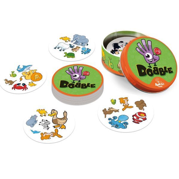 A sosit versiunea pentru copii a jocului indragit Dobble Esenta jocului Dobble este aceeasi trebuie sa gasiti cat mai repede imaginile potrivite pe cartile de joc. Cartile rotunde Dobble Kids cuprind mai putine imagini fata de versiunile celelalte. Imaginile reprezinta animale si ii vor incanta pe cei mici. Oricare doua carduri au un animal comun. Fiecare card este unic si are doar un singur animal in comun cu oricare alt card din pachet. Animalul comun poate fi greu de observat deoarece dimensiunea si pozitionarea simbolurilor poate varia pe fiecare card. Bazandu-se pe o vedere agera si pe reflexe rapide jocul Dobble Animals ii va captiva atat pe copii cat si pe parinti. Jocul poate fi jucat in cinci versiuni. Categoria de varsta 4 - 12 ani.Specificatii