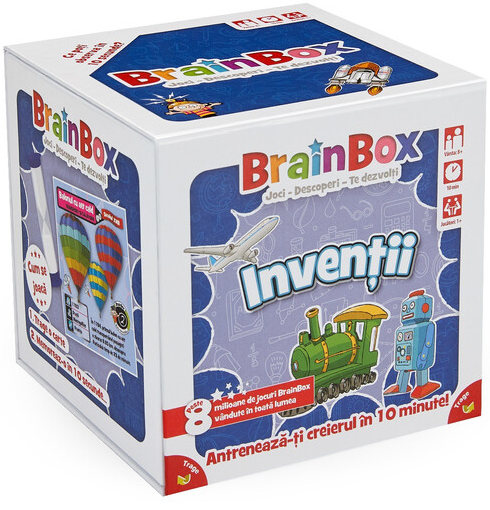 Acest joc inventiv este conceput pentru ca membrii familiei sa il joace impreuna pentru a-si imbunatati spiritul de observatie si capacitatea de memorare a informatiilor despre inventiile care ne-au schimbat modul de viata. Conceput cu concursul celui mai faimos Muzeu de Stiinte din Londra fiecare cartonas prezinta o inventie cand a fost inventata si de cine si propria noastra nota acordata acesteia. Ce nota ai acorda telefonului becului sau modestului pliculet de ceai Invata despre aceste inventii si despre multe altele cu ajutorul acestui joc distractiv de familie. Cum se joaca BrainBox Obiectivul jocului Fii jucatorul cu cele mai multe cartonase adunate dupa 10 minute. 1. Daca esti cel mai tanar jucator tragi un cartonas din cutie si intorci clepsidra. 2. Studiezi imaginea si informatiile de pe fata cartonasului pana cand se scurge nisipul din clepsidra 10 secunde . Clepsidra mai poate fi intoarsa inca o data pentru ca jucatorii mai tineri sa aiba mai mult timp pentru a studia cartonasul. 3. Apoi dai cartonasul unui alt jucator si dai cu zarul. Vei raspunde la intrebarea cu numarul indicat de zar. Ex. Daca dai cu zarul un doi atunci vei raspunde la intrebarea cu numarul doi . Un alt jucator iti citeste intrebarea si apoi verificati impreuna daca raspunsul tau este corect intorcand cartonasul. 4. Daca ai raspuns corect pastrezi cartonasul. Daca ai gresit pui cartonasul inapoi in cutie si urmatorul jucator trage un cartonas. Castiga jucatorul cu cele mai multe cartonase dupa zece minute de jocSpecificatii