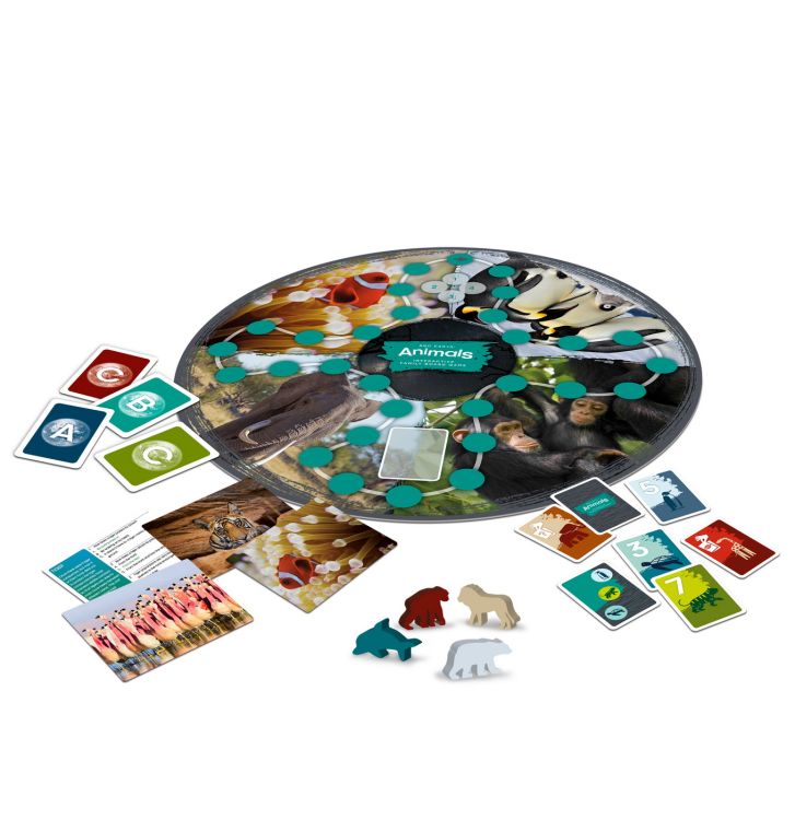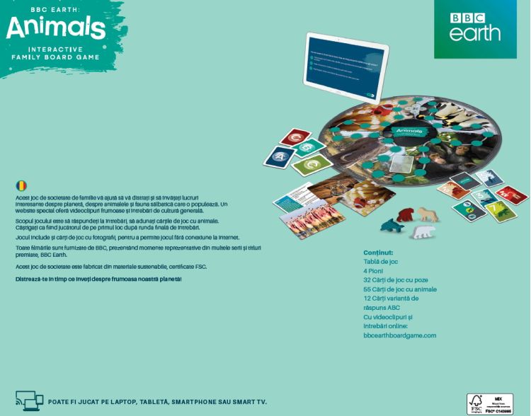 BBC Earth Animals este un joc interactiv, care te invata lucruri distractive si interesante despre planeta, despre animalele care traiesc aici si despre fauna. Puteti gasi videoclipuri frumoase si intrebari interesante pe site-ul web al jocului. Scopul jocului este de a strange carti cu animale cu raspunsuri corecte si apoi de a le trece pe trepte, pentru ca oricine este in frunte dupa ultima runda castiga jocul. Daca nu aveti o conexiune la internet, pur si simplu ridicati si jucati cartile ilustrate pentru joc. Toate videoclipurile pentru joc au fost puse la dispozitie de BBC, inclusiv momente speciale din seria premiata BBC Earth. BBC Earth Animals este un joc de societate interactiv realizat din materiale durabile, certificate FSC. Bucurati-va de joc si cunoasteti frumoasa noastra planeta. Continutul jocului: tabla de joc, 4 piese, 32 de carti cu imagini, 55 de carti cu animale, 12 discuri de raspuns ABC, videoclipuri si intrebari online: www. bbcearthboardgame. com. BBC Earth Animals este un joc de societate interactiv care poate fi jucat pe un laptop, tableta, smartphone sau smart TV. Recomandat pentru 2-4 jucatori incepand cu varsta de 8 ani, timp de joc aprox. 45 min.