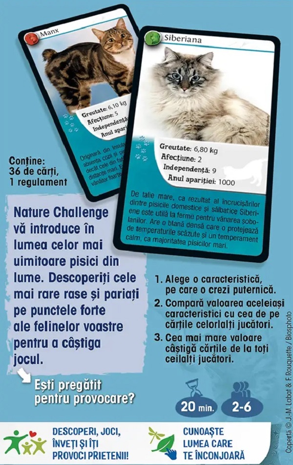 Nature Challenge Pisici va introduce in lumea celor mai uimitoare pisici din lume. Descoperiti cele mai rare rase si pariati pe punctele forte ale felinelor voastre pentru a castiga jocul Esti pregatit pentru provocare Cum se joaca 1. Alege o caracteristica pe care o crezi puternica. 2. Compara valoarea aceleiasi caracteristici cu cea de pe cartile celorlati jucatori. 3. Cea mai mare valoare castiga cartile de la toti ceilalti jucatori. Contine 36 de carti regulament 2-6 jucatoriSpecificatii