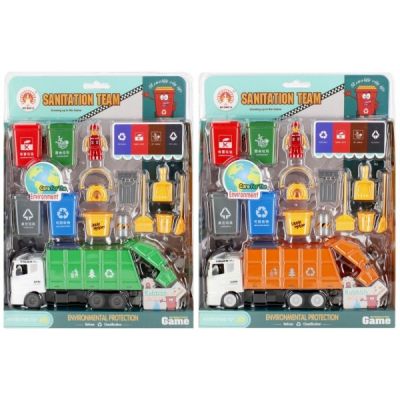 Setul include: O masina de gunoi, 4 containere de gunoi, o figurina, un cos de gunoi, un mop, o matura, un cos de gunoi, o galeata cu storcator, o cutie de gunoi.