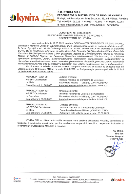 Produs virucid conform legislatiei in vigoare (Regulamentul UE nr. 528/2012):