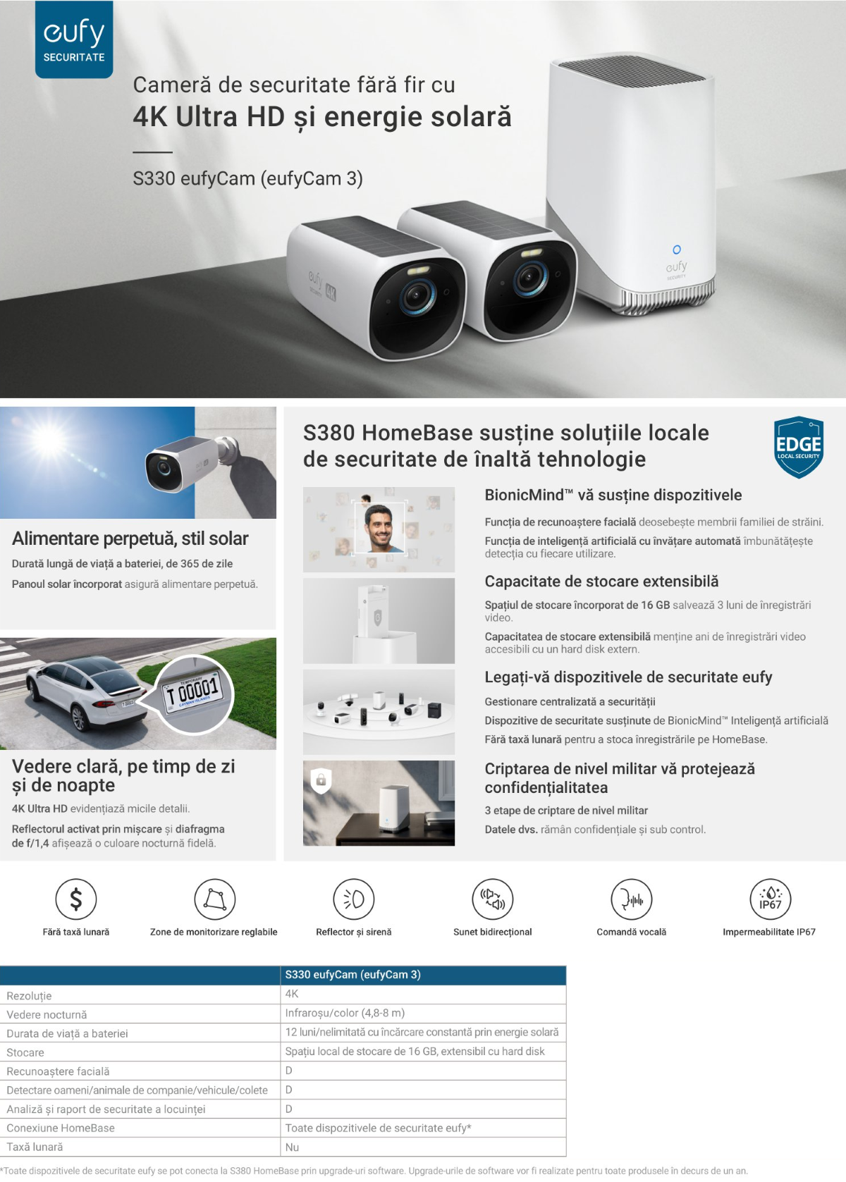 Kit supraveghere video eufyCam 3 S330, 4K Ultra HD, Incarcare solara, BionicMind™, Nightvision, Homebase 3 + 2 camere video