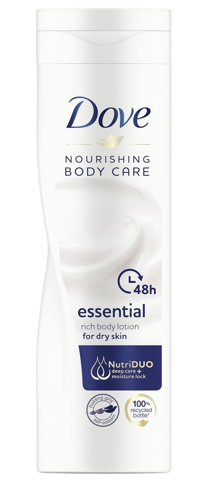Loțiunea de corp Dove Essential Nourishment asigură pielii hidratarea necesară și îi conferă o netezime catifelată.