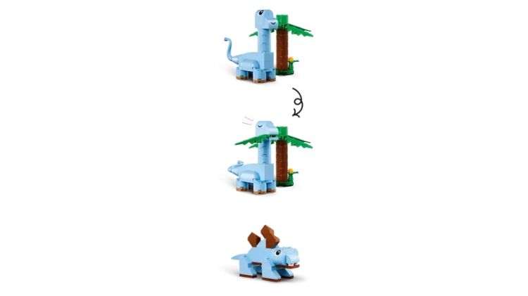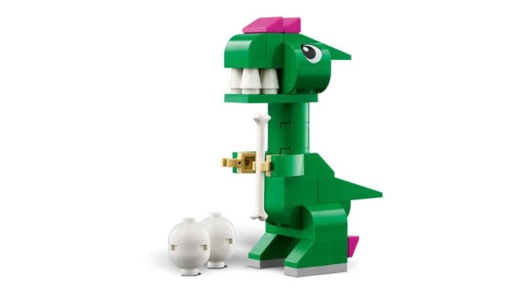 Dinozaurii LEGO rapid de construit infatiseaza un T. rex, un pterozaur, un triceratops, un brontozaur si un pui de T. rex intr-un ou, iar setul contine un vulcan, un palmier si accesorii pentru a inspira joaca fantezista a copiilor. Pe langa caramizile colorate si variate, setul include si elemente speciale, precum ochi si guri pentru a adauga expresii pe fetelor dinozaurilor. Distractia creativa continua cand copiii combina caramizile pentru a-si modifica creaturile. Pe masura ce copiii devin mai increzatori in abilitatile lor de constructie, pot urma ghidul intuitiv pentru a crea propriile modele fanteziste de dinozauri.