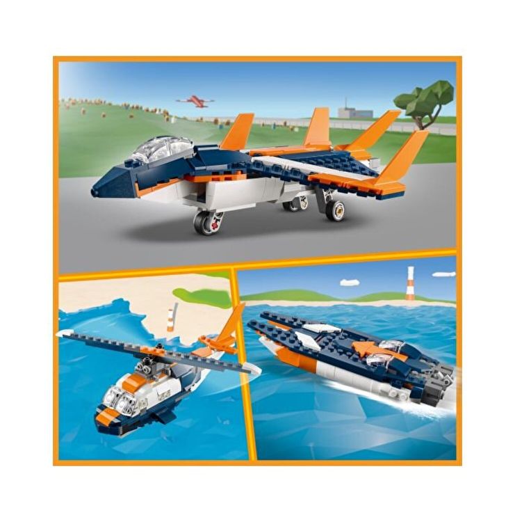 Setul de joc include instructiuni digitale interactive de constructie pentru a face experienta si mai distractiva. Disponibile in aplicatia gratuita Instructiuni de constructie LEGO pentru smartphone-uri si tablete, instrumentele de zoom si rotire ajuta copiii sa vizualizeze modelul pe masura ce construiesc. Traieste experienta unor aventuri uimitoare in aer sau pe apa! Treci la comenzile incredibilului Avion supersonic pentru a executa acrobatii spectaculoase pe cer. Odata ajuns la sol, reconstruieste avionul ca un elicopter cu pale rotative si ridica-te din nou in aer, sau reconstruieste-l ca o barca cu motor pentru distractie la viteze mari pe apa. Cu acest set 3 in 1, posibilitatile sunt nelimitate.