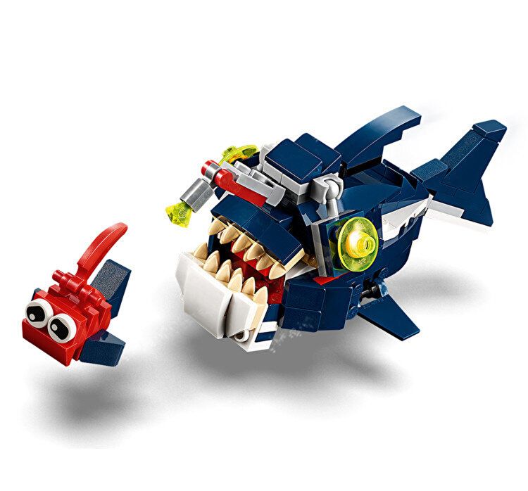Descopera viata marina cu setul LEGO Creator 3 in 1 31088 Creaturi marine din adancuri (31088 Deep Sea Creatures), care contine un rechin infricosator cu o schema de culoare realista pe albastru inchis si alb, cu gura plina de dinti ascutiti, aripi mobile, incheieturi ale corpului articulate si ochi reflectorizanti, plus un crab articulat cu o cutie de comori.Cu seturile LEGO Creator 3 in 1 ai parte de trei constructii si experiente de joaca diferite. Construieste rechinul si crabul, apoi reconstruieste-le intr-un calamar articulat, sau intr-un peste pescar pentru si mai multa distractie marina.