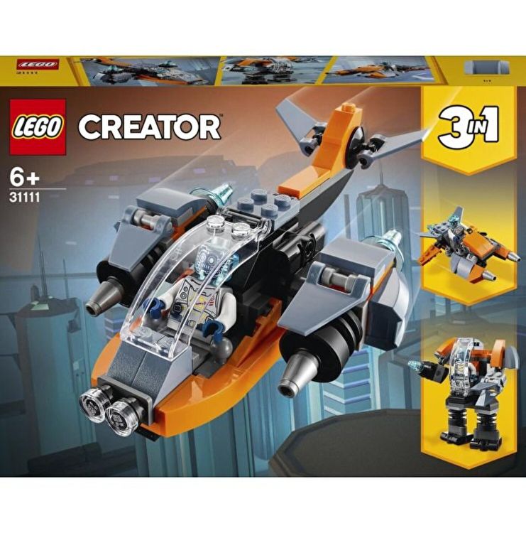 Micii exploratori ai spatiului se pot bucura de 3 experiente diferite de constructie si joaca cu acest set de jucarii LEGO Creator 3 in 1. Ei pot construi drona cibernetica, iar apoi o pot reconstrui intr-un robot cibernetic sau scuter cibernetic. Setul de jucarii vine cu o minifigurina robot noua din ianuarie 2021, cu cap albastru transparent, ce poate calatori in fiecare dintre cele 3 modele.