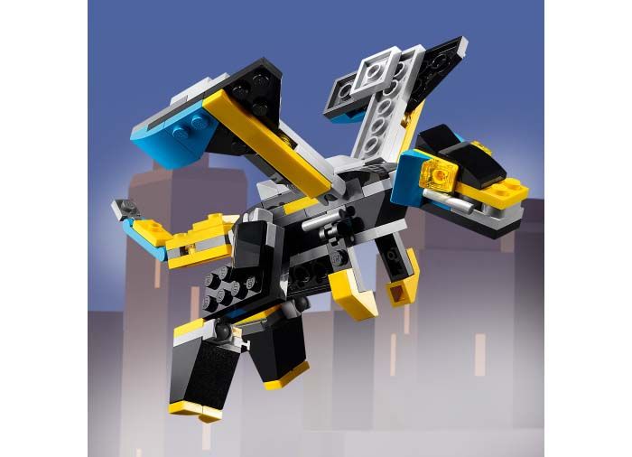 Calatoreste in viitor pentru aventuri uimitoare cu acest Super Robot senzational! El poate proteja orasele cu puterea sa incredibila sau se poate inalta spre cer cu aripile sale. Dupa aceea, reconstruieste robotul ca un dragon pozitionabil, sau avion rapid cu aripi reglabile pentru o actiune si mai fantezista - sau foloseste aceleasi caramizi pentru a crea ceva cu totul nou! Tu alegi, cu acest set minunat 3 in 1.
