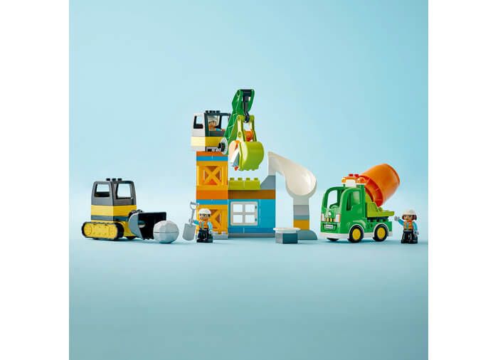 Pune bazele unor solide abilitati de constructie cu setul LEGO DUPLO Town santierul 10990 . Plin de dotari acesta contine detalii care inspira joaca pe roluri si ajuta la dezvoltarea exprimarii de sine. Copii de 2 ani invata despre munca in echipa pe masura ce trioul de muncitori constructori opereaza cele 3 vehicule. Buldozerul cara bolovanul iar macaraua il apuca si-l transporta la tobogan de unde aluneca in betoniera. Cand munca se incheie muncitorii sunt rasplatiti cu o pizza gustoasa pentru treaba bine facuta. Jucarii educationale pentru micii constructori Aceasta jucarie cu santier ofera ore de distractie creativa prin multele elemente care tin ocupate manutele copiilor. Macaraua se roteste iar graifarul sau se deschide si se inchide. Tamburul autobetonierei viu colorate ce poate fi condusa chiar se roteste. Oferind stimulare senzoriala sirena autobetonierei e prevazuta cu 3 sunete diferite si lumini intermitente. Ajuta-ti prescolarul sa interpreteze pe roluri lumea pe care o vede in jur cu jucariile LEGO DUPLO Town. Atentie Contraindicat copiilor mai mici de 3 ani. Jucaria produsul poate contine piese mici care se pot inghiti sau inhala existand pericolul de sufocare. Nu lasati ambalajele jucariilor produselor la indemana copiilor. Indepartati orice ambalaj al jucariei produsului inainte de a da jucaria produsul copilului. Va rugam sa supravegheati copilul in timp ce se joaca foloseste acest produs. Pastrati instructiunile si etichetele pentru referinte viitoare. Pastrati jucaria produsul departe de foc feriti jucaria produsul de temperaturi ridicate si umiditate.Specificatii