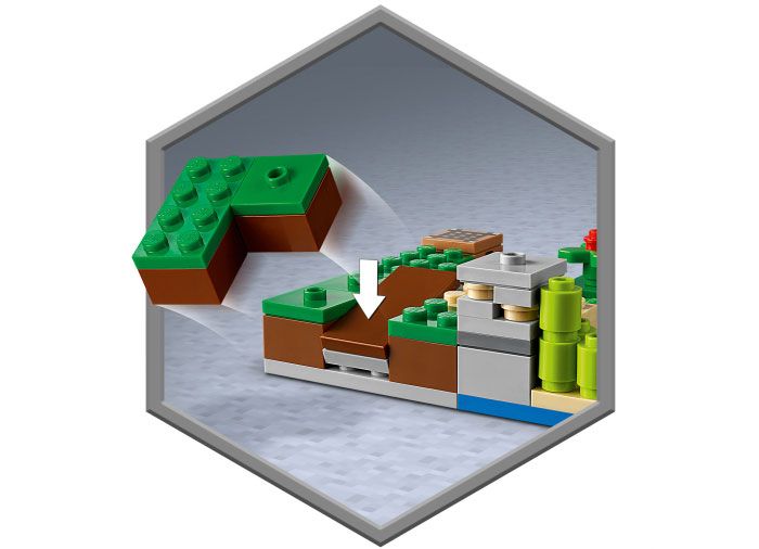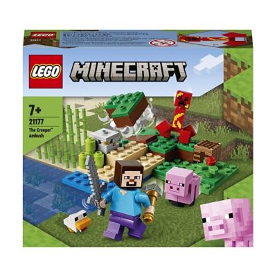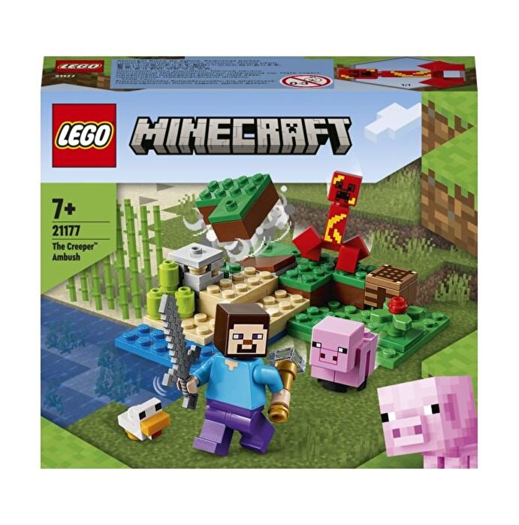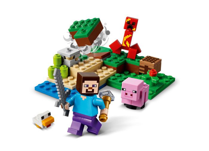 In aceasta aventura compacta clasica Minecraft sunt multe lucruri care vor captiva copiii. Lui Steve, unul dintre personajele erou ale jocului, i se alatura un purcelus, un puisor si un Creeper exploziv. Mai intai, copiii devin creativi cu minereul de fier la masa de crafting. Apoi au grija de animale, ingrijesc cultura de trestie de zahar si decoreaza scena cu maci. Dupa aceea, folosesc o sabie pentru a se lupta cu temutul Creeper exploziv. Batalia ajunge la apogeu cand copiii apasa blocul special de detonare care arunca Creeper-ul exploziv in aer. Dupa terminarea actiunii, acest set plin de distractie arata grozav expus in camerele copiilor.