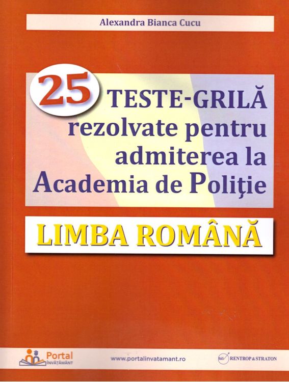 Iti oferim lucrarea care te ajuta sa parcurgi intreaga materie prevazuta in programa de examen sa testele-grila sunt rezolvate si explicate sa intelegi solutiile oferite sa te autoevaluezi in orice moment sa asimilezi toate itemurile la nivelul cerut de exigenta cadrelor din Academiei. Lucrarea iti asigura acum urmatoarele avantaje 1. tehnica verificata de abordare a procesului de pregatire pentru examen 2. disciplina studiului pe 3 directii simultan 3. antrenament sustinut in conformitate cu cerintele programei in vigoare prin teste dupa modelul celor emise de Ministerul Educatie si Invatamantului 4. pregatire superioara cu teste-grila REZOLVATE si EXPLICATE 5. raspunsuri corecte bazate pe intelegere nu pe invatare mecanica 6. incadrarea in timpul util de pregatirea ramas pana la examen 7. echilibrul emotional si psihic - adesea mentionat ca factori generatori de esec 8. cresterea increderii in fortele proprii 9. o importanta economie de timp bani si energie. Antrenament eficient cu rezultate de succes Cele 25 de TESTE-GRILA sunt conforme cu modelul de examen pentru admiterea la Academia de Politie si cu programa de examen I. Lexicul 1. Vocabularul fundamental si masa vocabularului 2. Cuvantul sensul cuvintelor in context tipuri de sensuri rolul contextului dublete etimologice 3. Mijloace interne de imbogatire a vocabularului derivarea compunerea conversiunea familia lexicala 4. Mijloace externe de imbogatire a vocabularului imprumuturile lexicale 5. Neologismele sinonime antonime omonime paronime cuvinte polisemantice 6. Pleonasmul tautologia 7. Unitati frazeologice locutiuni expresii II. Notiuni de fonetica 1. Vocale consoane semivocale diftong triftong hiat 2. Silaba despartirea in silabe a cuvintelor 3. Accentul accentuarea corecta in limba romana III. Morfosintaxa 1. Partile de vorbire flexibile a. clasificare verb substantiv articol pronume numeral adjectiv b. locutiunile c. categorii morfologice diateza conjugare mod timp persoana numar gen caz grad de comparatie d. functii sintactice 2. Partile de vorbire neflexibile a. clasificare adverb prepozitie conjunctie interjectie b. locutiuni c. functii sintactice adverb interjectie IV. Sintaxa propozitiei si a frazei 1. Relatii sintactice 2. Fraza 3. Propozitia si partile de propozitie 4. Acordul gramatical.Specificatii