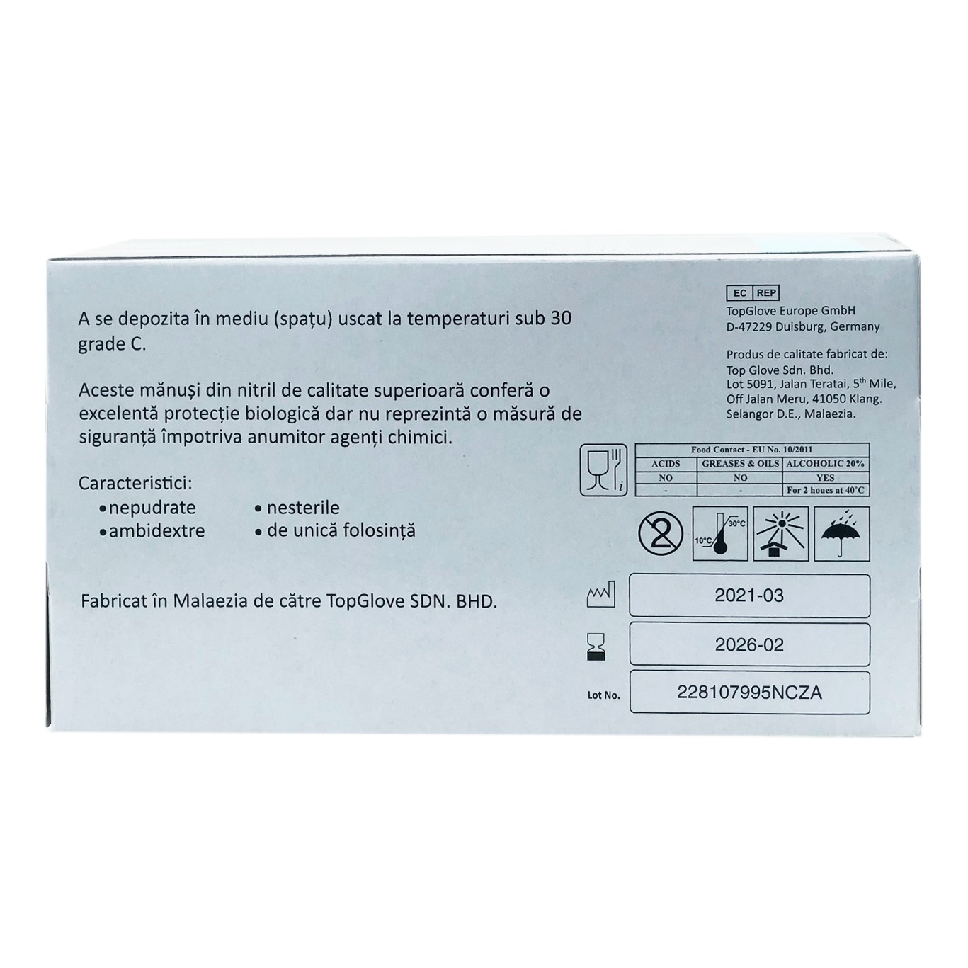 Caracteristici: - de unica folosinta; - nepudrate; - nesterile; - texturate; - datorita moliciunii si a senzatiei naturale confera un confort sporit; - asigura protectie si dexteritate in folosire; - manseta cu bordura face ca manusa sa nu alunece sau sa se ruleze A se pastra in locuri racoroase si uscate, protejate de razele soarelui sau de alte surse de caldura. Ambalaj: Cutie: 100 buc Culoare: Albastru Dimensiuni: XLSpecificatii
