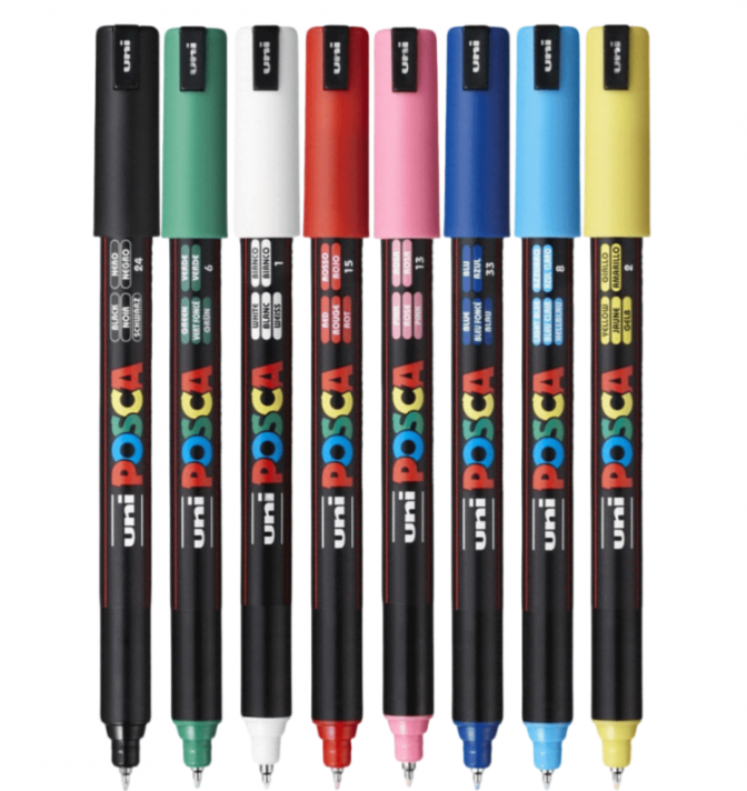 Hartie carton lemn piele sticla Un singur marker este potrivit pentru a scrie si a realiza decoratiuni pe orice suprafata UNI Posca PC-1M Cerneala este pe baza de apa permanenta pe suprafete poroase si nepermanenta pe suprafete lucioase. Culorile se mixeaza intre ele fapt pentru care se pot obtine noi nuante atat timp cat cerneala este inca umeda si sunt solubile in apa pentru efecte de gradient. Corpul markerului este din plastic rezistent cu varf de tip carioca cu scriere de 0. 7 mm. Vine prevazut cu o supapa care etanseaza perfect pentru a pastra culoarea in interiorul markerului in cele mai bune conditii. Poate fi utilizat pentru scris si desen pe lemn textile piele naturala si ecologica sticla ceramica piatra panza metal plastic hartie carton.Specificatii