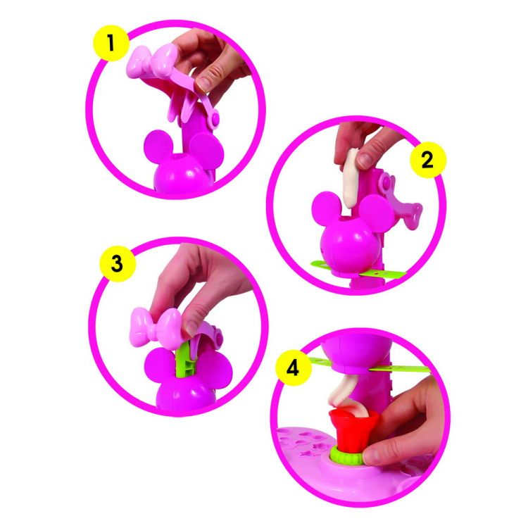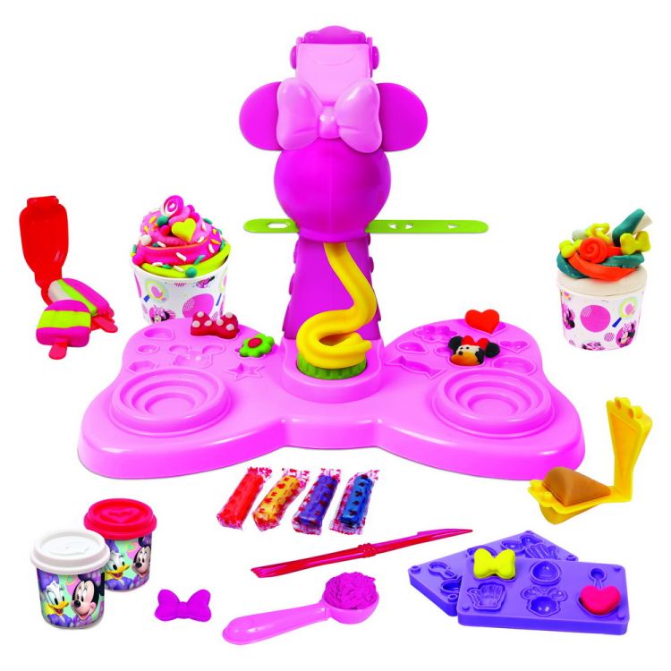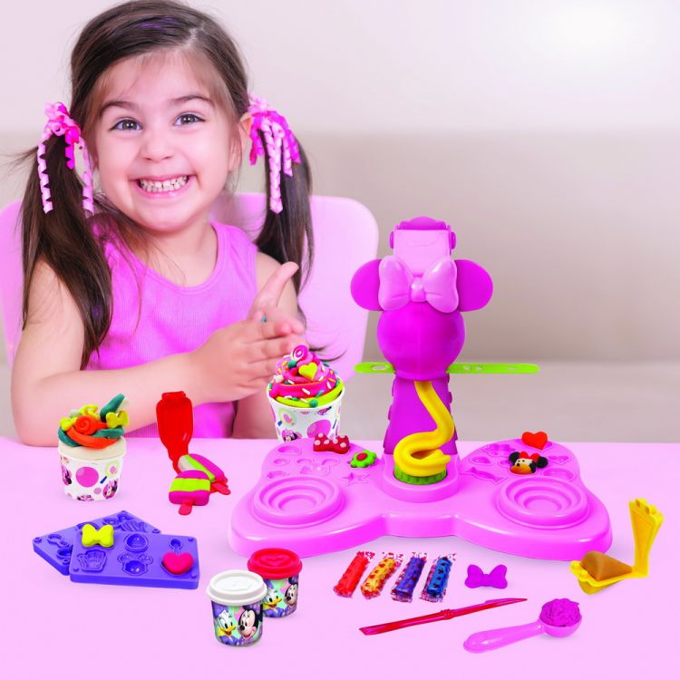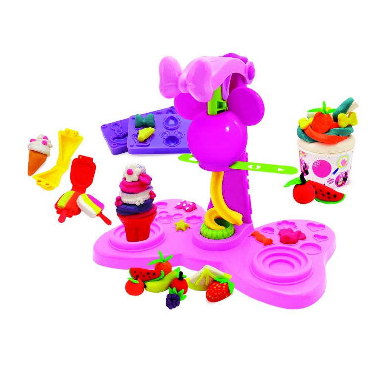 Minnie are propria masina de inghetata! Setul include 2 borcanase de plastilina de 114gr. fiecare, 4 borcanase de plastilina colorata de 20g fiecare, forme si multe alte accesorii de inghetata! Distreaza-te in bucatarie in stilul Minnie Mouse!