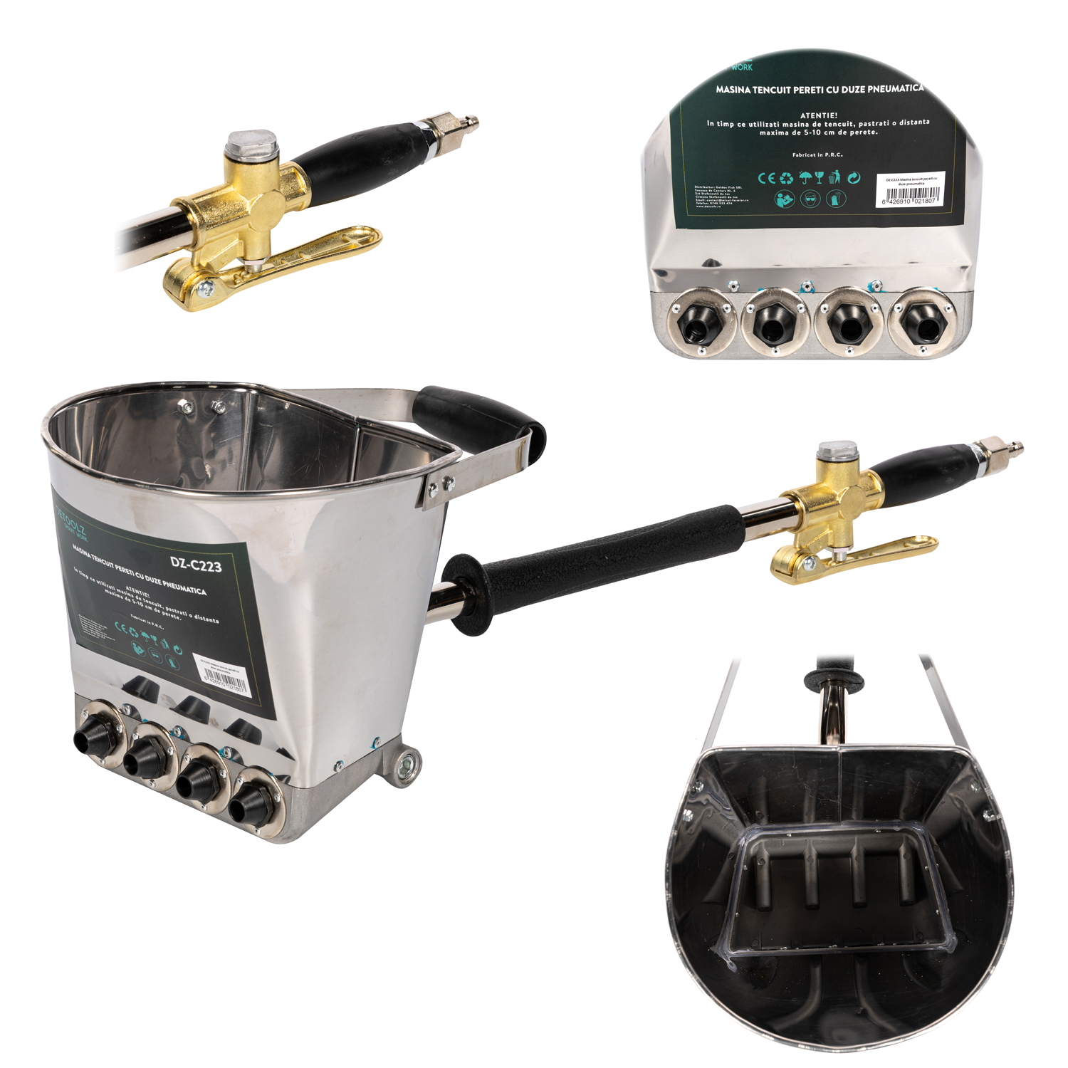 Masina de tencuit pneumatica cu duze Detoolz DZ C223 este destinata tencuirii peretilor. Avantajele masinii de tencuit pneumatice Detoolz DZ C223: •este simplu de montat/demontat si permite o curatare foarte usoara dupa utilizare; •mareste eficienta si viteza de tencuire a peretilor; •usor de operat de o singura persoana; •este fabricata din otel inoxidabil. • greutate redusa pentru confortul utilizatorului. Masina pneumatica tencuit tavan cu duze, Detoolz DZ C223 se compune din urmatoarele piese: •cuva; •maner; •galerie pneumatica; •supapa+robinet; •conector conducta de aer; •duze.Specificatii