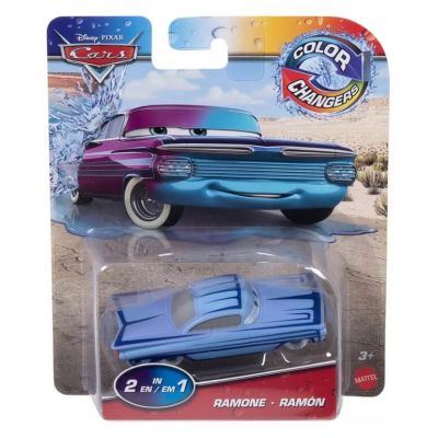 Noile masinute Cars isi schimba acum si culoarea. Scufunda masina in apa calda si vei observa cum isi schimba culoarea iar daca o scufunzi in apa rece revine la culoarea initiala. Colectia aduce cele mai indragite 8 personaje de la Fulger McQueen la Bobby Swift. Alege una din masinutele Cars - culori schimbatoare si castiga cursa Masinutele sunt construite la scara 1 la 55. In acest pachet este inclus personajul Ramone.Specificatii