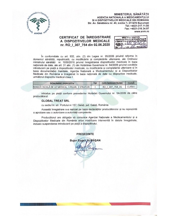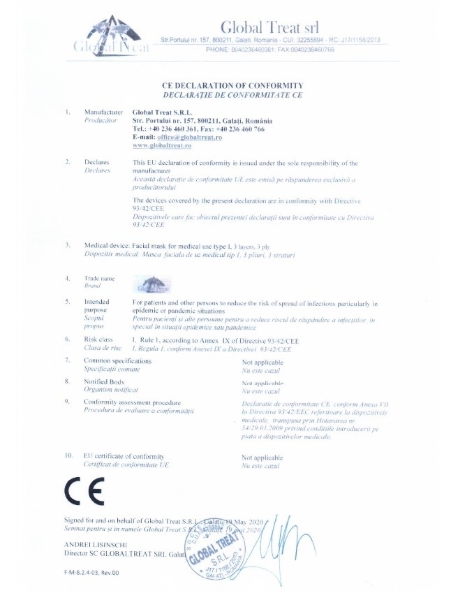 Produsul este fabricat in Romania! Global Masti de uz medical cu elastic tip 1, camuflaj 3 straturi, 50 de bucati
