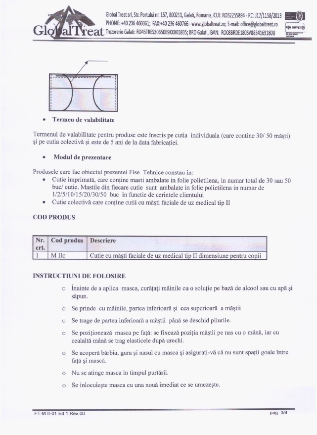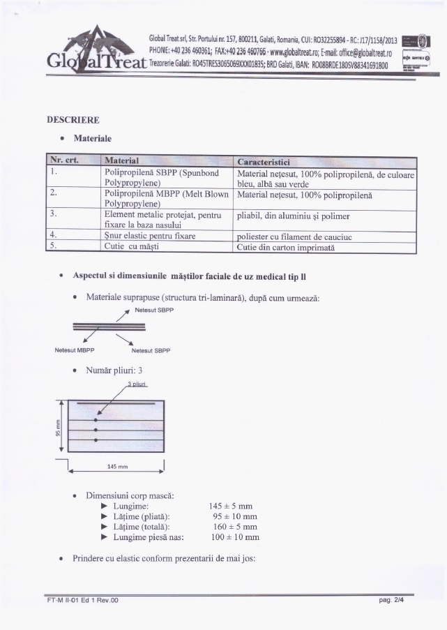 Masca medicala tip 2 bfe>98% pentru copii , conform standardului SR EN 14683, asigura o protectie eficienta impotriva tranferului de microorganisme si bacterii si pentru utilizarea generala de catre persoanele expuse la particule de praf sau alergeni. Masca faciala de uz medical tip 2 cu elastic este confectionata din polipropilena netesuta, in 3 straturi, confortabila, moale, respirabila si prietenoasa cu pielea. Cele 3 pliuri asigura o desfasurare sufiicienta pentru a acoperi nasul, gura si barbia pentru o pretectie completa. Produsul vine ambalat in cutie de 50 de buc., fiecare masca avand dimensiunile de 95×175 mm.