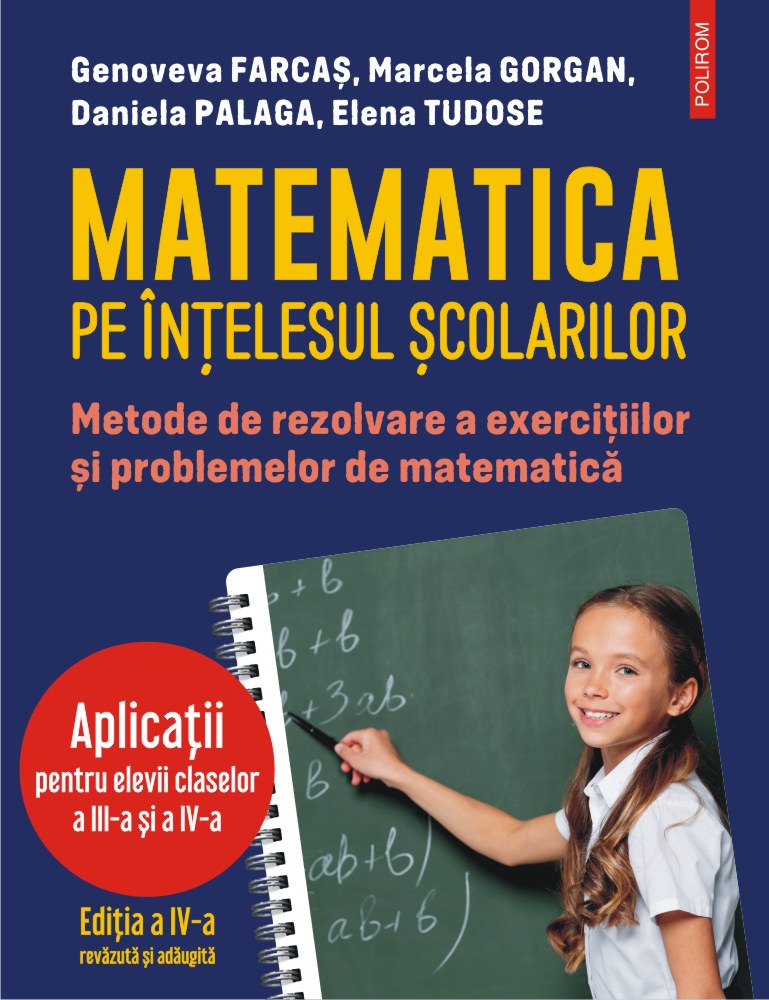 Aplicatii pentru elevii claselor a III-a si a IV-a Editia a IV-a revazuta si adaugita Matematica pe intelesul scolarilor este un auxiliar curricular conceput pentru a-i sprijini pe elevi, cuprinzand teme semnificative conform programelor scolare actuale. Structura si continuturile matematice din acest volum le ofera elevilor posibilitatea sa abordeze exercitii si probleme cu grad mare de dificultate, care nu sunt cuprinse in manualele scolare. Determinarea unui termen/factor necunoscut folosind ordinea operatiilor Determinarea cifrelor unui numar folosind descompunerea numerelor Aplicarea proprietatilor operatiilor aritmetice Probleme de suma si raport Probleme de diferenta si raport Probleme combinate Metoda mersului invers Metoda falsei ipoteze si metoda ipotezelor Probleme de transfer Probleme cu continut geometricSpecificatii