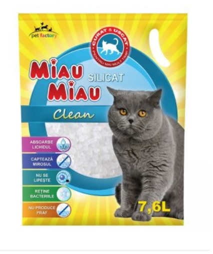 MIAU MIAU Silicat Clean 7.6L este un asternut igienic si absorbant din silicat natural, pentru litiera pisicii AVANTAJE: Absoarbe lichidul. Milioane de pori microscopici din fiecare granula de silicat Miau Miau absorb lichidul intocmai ca un burete, retinand bacteriile si impuritatile. Nu se lipeste. Datorita marimii si formei speciale, granulele de silicat Miau Miau nu se lipesc pe blana sau pe labutele pisicii. Capteaza mirosul. Mirosurile neplacute sunt captate eficient, iar aerul din imprejurimi este mentinut curat. Nu produce praf. Asternutul igienic din silicat Miau Miau nu produce praf si nu irita, in acest fel, ochii si nasul pisicii. INSTRUCTIUNI DE UTILIZARE: Umpleti litiera pisicii cu un strat de 3.5-4cm de silicat Miau Miau Clean. Asezati litiera intr-un loc uscat si aerisit. Indepartati excrementele zilnic pentru a pastra litiera curata. Completati cu silicat nou, atunci cand stratul din litiera scade.