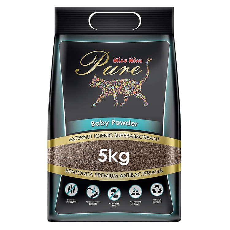 MIAU MIAU PURE BABY POWDER 5 kg este un asternut igienic superabsorbant pentru pisici, din bentonita premium antibacteriana uscata la soare, cu parfum de talc.