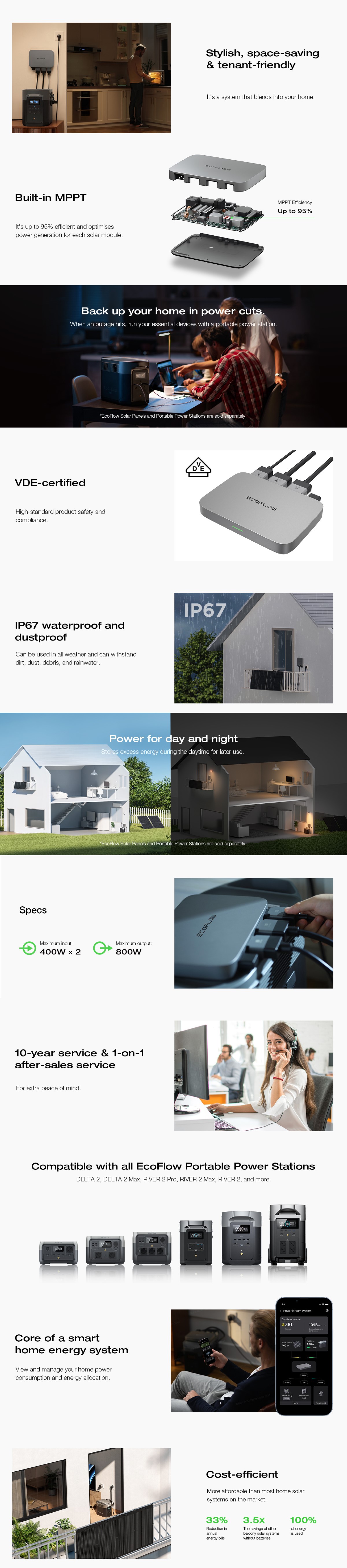 Micro-invertorul EcoFlow este nucleul sistemului solar de balcon PowerStream. Canalizeaza energia solara pentru utilizare imediata acasa sau catre statiile de alimentare portabile si o stocheaza pentru nevoile viitoare, maximizand economiile la factura de energie.