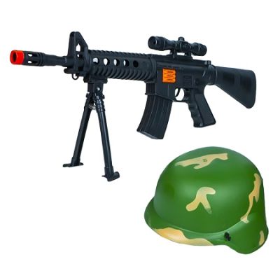Orice baietel iubeste sa creada ca este un mic erou si ca poate salva lumea. Acest set cu siguranta il va incanta atunci cand va intra in rolul personajului - erou militar. Caracteristici - Jucaria contine casca si mitraliera cu luneta si suport. - Inainte de utilizarea jucariei este necesara asamblarea mitralierei se atasaza luneta si suportul la corpul armei se fixeaza teava prin imbinare. - La apasarea tragaciului se aude un sunet ce imita sunetul de tragere. - Casca are elastic de fixare sub barba. - Produsul este realizat din plastic rezistent non-toxic. - Jucaria se poate folosi atat pentru joaca in interior cat si in aer liber. - Neavand proiectile jucaria poate fi utilizata de catre copiii mai mici care isi doresc o arma de jucarie. - Efectul jocului asupra dezvoltarii abilitatilor motrice este deosebit de important iar copilul prin joc isi coordoneaza miscarile cu atentia vizuala. In final prin aceste jocuri copilul intra in contact cu conceptele de bine si rau dezvoltand abilitati sociale si sentimentul de incredere si empatie. - Ambalaj plasa. Dimensiune arma asamblata 53x23. 5x11. 5 cm Dimensiune casca 20. 5x19. 5x12 cm Avertizare Produsul este nou si comercializat in ambalajul original al producatorului. Imaginile de pe site au caracter informativ. Produsul nu functioneaza cu baterii. Ambalajul trebuie indepartat recuperat si aruncat de catre un adult inainte de a se da spre utilizare copilului. Nu lasati ambalajele produselor la indemana copiilor. Se recomanda utilizarea produsului sub supravegherea unui adult. Produsul poate contine piese mici care se pot inghiti sau inhala de cei mici existand pericolul de sufocare sau nu este potrivita copiilor mai mici de 3 ani. Pastrati instructiunile si etichetele pentru referinte viitoare. Pastrati produsul departe de foc si nu il lasati in preajma temperaturilor ridicate si a umiditatii. Datorita masurarii manuale a produsului poate exista o diferenta minora fata de dimensiunea reala a produsului.Specificatii