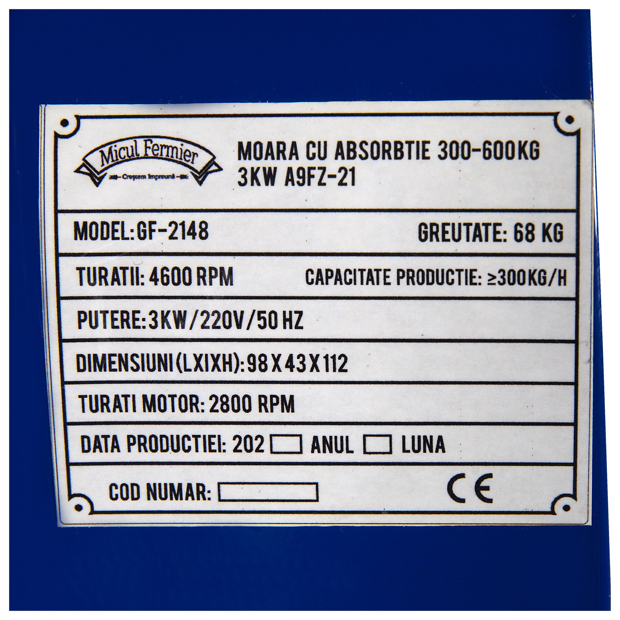 Moara de cereale cu absorbtie 300-600kg, 3KW, A9FZ-21, Micul Fermier GF-2148 este un produs de uz gospodaresc pentru macinarea boabelor de cereale (grau, porumb, orz, secara, etc.), de oleaginoase (srot de floarea soarelui, soia, rapita, etc.), leguminoase(fasole, usturoi, etc.) si amestecuri ale acestora, in scopul obtinerii de faina furajera necesara hranirii animalelor din micile ferme individuale. Pentru o functionare eficienta si fara pierderi, se recomanda ca materia prima sa fie in prealabil foarte bine uscata la soare cateva zile dupa recoltare. Moara trebuie instalata pe o suprafata stabila si neteda intr-un loc deschis si uscat. Moara de cereale cu absorbtie 300-600kg, 3KW, A9FZ-21, Micul Fermier GF-2148 are urmatoarele caracteristici: • Design ergonomic si un plus de confort prin sistemul de alimentare automata cu boabe; • Asigura reducerea semnificativa a duratei de macinare a boabelor fara efort in comparatie cu o macinare realizata manual; • Moara dispune de un sistem de alimentare automata de mare capacitate care permite preluarea boabelor de cereale direct din sac sau depozit; • Produsul se comercializeaza cu motorul ambalat separat - acesta necisita montare; • Moara functioneaza la nivel de zgomot redus; • Moara dispune de un sistem de ajustare a debitului de boabe pentru reglarea corecta a vitezei de macinare la niveluri optime; • Productivitate foarte mare de macinare de peste 300kg/ora; • Construit din materiale de fabricatie de cea mai buna calitate, usoare si rezistente pentru o durata de viata extinsa; • Produs cu raport pret/calitate excelent. Continut colet moara de cereale cu absorbtie 300-600kg, 3KW, A9FZ-21, Micul Fermier GF-2148: • Moara cereale fara motorizare - 1 buc; • Motor electric - 1 buc (disponibil sau nu in functie de oferta de comercializare); • Surubelnita - 1 buc.; • Pensula curatare; • Sac colectare; • Cutie de transport/depozitare. Se pot achizitiona separat mai multe tipuri de site.Specificatii