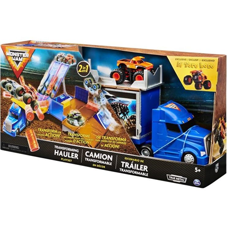 Acest set de joc 4 in 1 include un tractor, spatiu de depozitare pentru cinci camioane, set de joc cu rampe, gogoasa si spinnerul gogoasa si cursa in panta alaturata cu actionare a butoiului pentru ore intregi de distractie! Actiunea Epic Monster Jam continua cu jocul oficial Transforming Hauler Playset! Acest joc minunat Monster Jam, la scara 1: 64, arata exact ca Hauler-ul care aduce camioanele Monster Jam la fiecare spectacol! Transforming Hauler Playset este plin de atatea caracteristici interesante de descoperit. Desfasurati transportatorul pentru a gasi rampe de curse cot la cot, butoaie, un filator de gogosi si multe altele! Cu un camion exclusiv Monster Jam El Toro Loco la scara 1: 64 inclus, puteti invarti gogosi pe spinner pentru gogosi si puteti practica cascadorii si sarituri cu rampele si accesoriile incluse. Apoi, este timpul pentru actiuni de curse cot la cot! Montati butoaiele deasupra cabinei Hauler si asezati El Toro Loco si un alt camion 1: 64 Monster Jam din colectia dvs. (vandut separat) in partea de sus a rampelor. Lansati-va camioanele si urmariti cum se prabusesc pe rampe, zdrobind printre butoaie! Resetati butoaiele si faceti-o din nou - cu Transforming Hauler Playset, actiunea Monster Jam nu se opreste niciodata! Cand ati terminat de redat, pliati cu usurinta setul de joc si stocati tot continutul in interior. In plus, puteti monta un camion Monster Jam la scara 1: 64 in containerul transportatorului si patru dintre preferatele dvs. deasupra! Pentru chiar si mai multe cascadorii Monster Jam, adaugati setul de joc Max-D Break Free (vandut separat) la colectia dvs. Aduceti actiune actiune cot la cot cu jocul Monster Jam Transforming Hauler Playset!