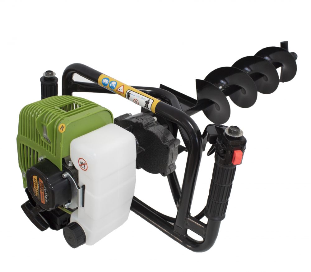 Pentru plantarea pomilor tineri puteti folosi si diametre mai mici, de 100 mm (nu se include in set). Motoburghiul poate fi purtat si manevrat usor de o singura persoana, cu gidonul cu doua manere. Forarea unei gauri verticale in sol este lejer de executat, ajustand acceleratia si efortul in functie de duritatea solului si a diametrului burghiului.