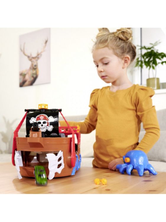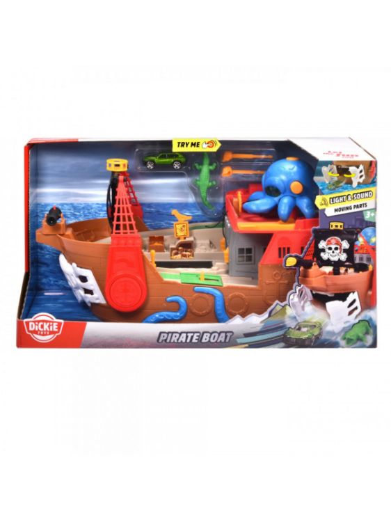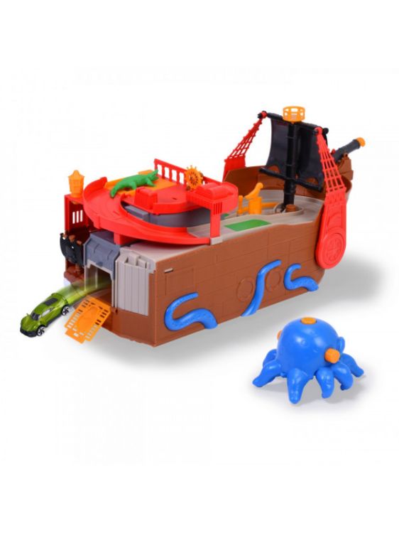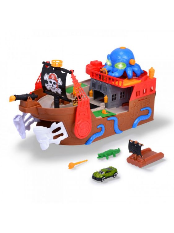 Set corabie de pirati cu sunet si lumini. Cu acest set de joaca cool copiii pot vasli pe mare si se pot juca cele mai interesante aventuri ale piratilor. Setul de joaca include o corabie de pirati de 41 5 cm cu un compartiment secret de lansare a masinutei astfel incat poti lansa masinuta din cutie din interiorul corabiei. Barca de jucarie este echipata cu un tun functional si o vela cu un model cool iar pluta inclusa permite masinutei sa se balanseze singura pe mare. Ochii caracatitei de pe barca pirat sunt iluminati iar barca este dotata cu efecte sonore pentru a spori emotia. si asta nu este tot Corabia piratilor pluteste de fapt pe apa asa ca cei mici o pot lua cu ei la baie sau la piscina.Specificatii