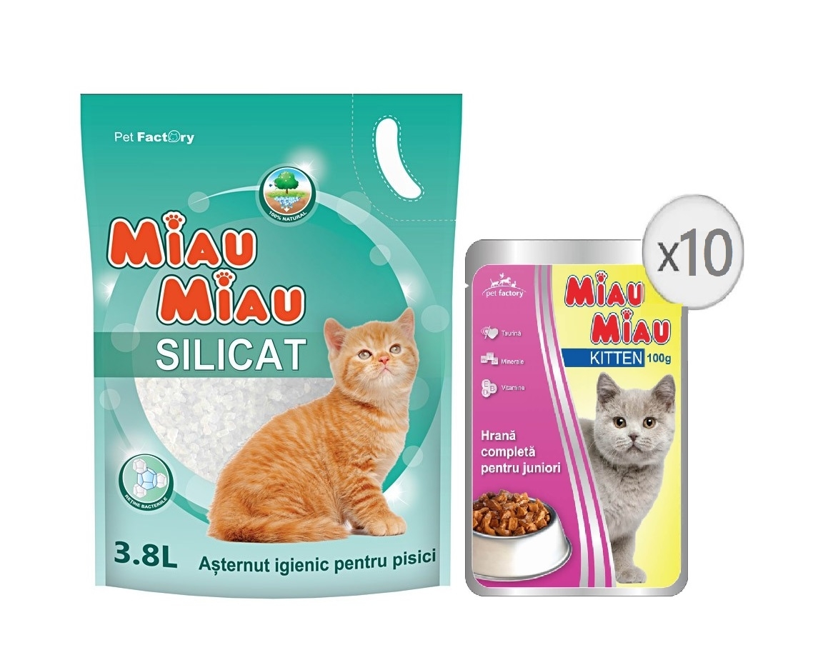 Pachet Miau Miau Asternut silicatic 3.8L + Miau Miau Plic Kitten 100g x 10 buc