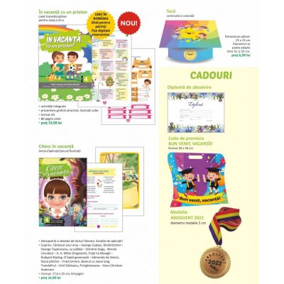 Pachetul de premiere este special conceput pentru a-i recompensa pe elevi la final de an scolar si a sprijini exersarea pe durata vacantei de vara. Este compus din In vacanta cu un prieten - caiet transdisciplinar cu jocuri exercitii si aplicatii format A4 80 pagini Citesc in vacanta - lecturi aplicatii jocuri ilustratii format B5 64 pagini Diploma de absolvire cu model floral Medalie cu mesajul Absolvent 2022 Toca multicolora Cutie cartonata cu mesajul Bun venit vacantaSpecificatii