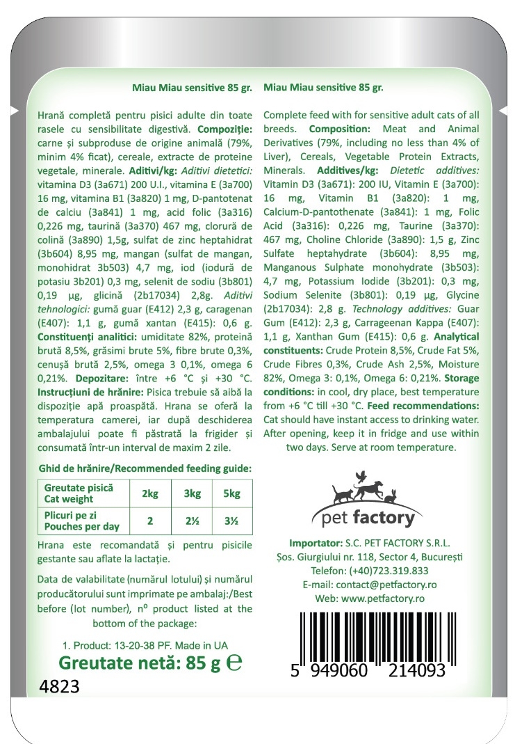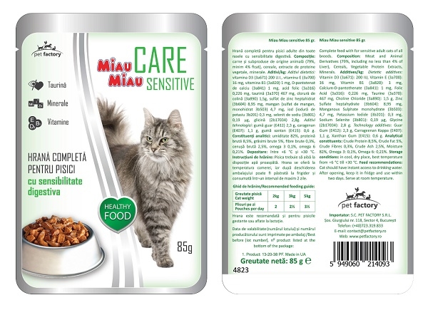 PLICULETELE MIAU MIAU CARE SENSITIVE CU FICAT IN SOS 12 x 85 g contin o hrana completa cu ficat pentru pisici adulte cu sensibilitate digestiva.